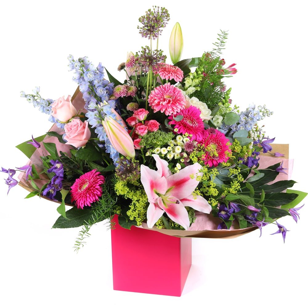 Show your grand affection with this luxurious bouquet of the finest blooms of the season. Arranged in beautiful packaging, this bouquet is perfect for expressing your deepest emotions and making a lasting impression.